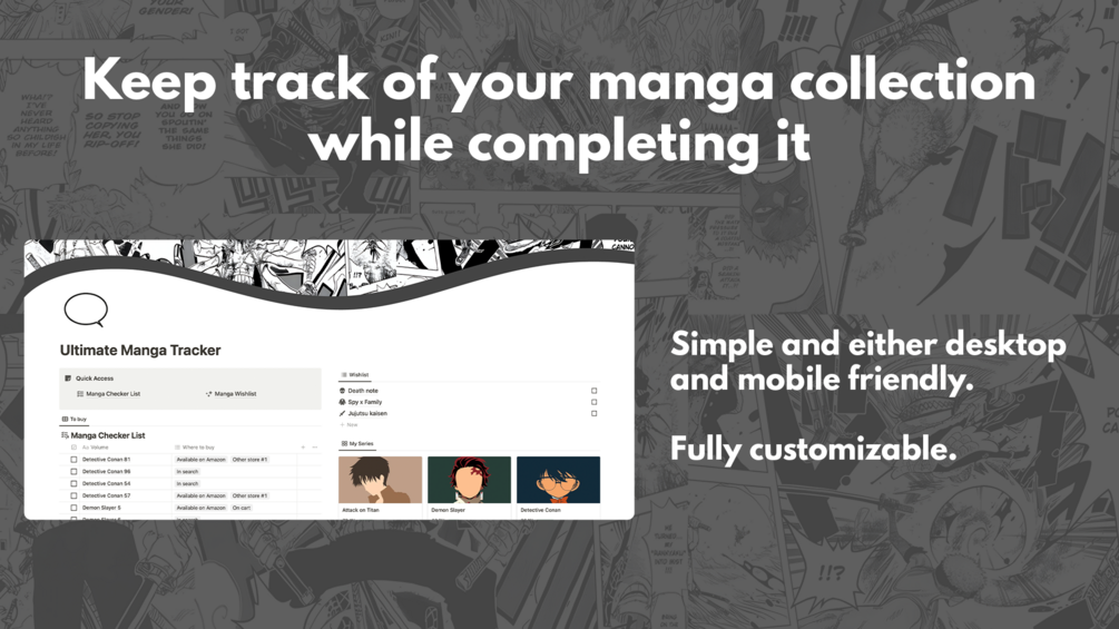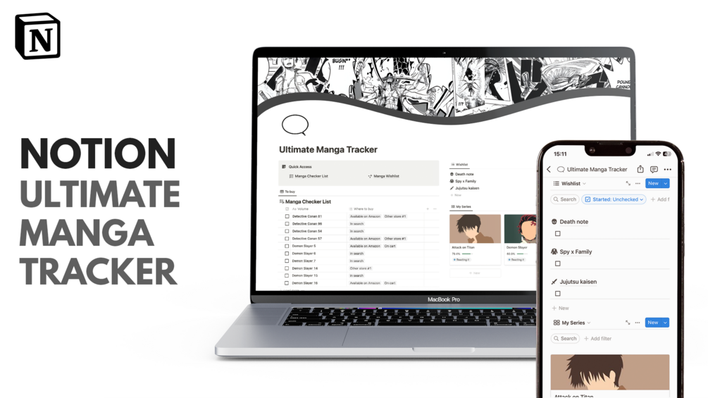 "Ultimate Manga Tracker" was created with the needs of manga collectors like you in mind. Now you can enjoy a simpler and more organized collection management, without ever losing sight of the manga you desire and those missing from your collection. Make your manga passion even more engaging with this Notion tool.