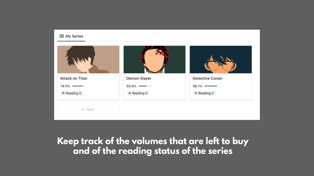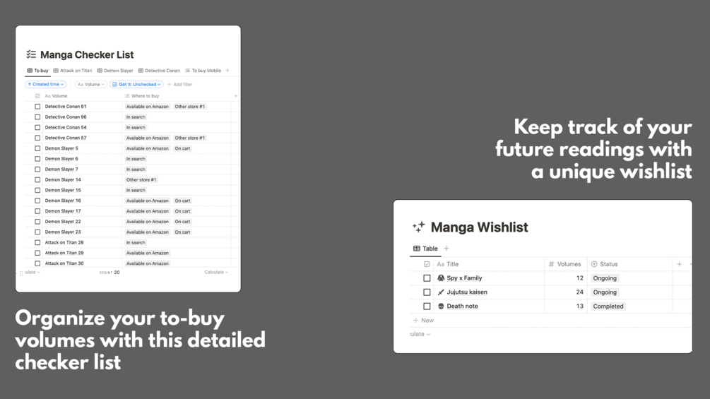 With "Ultimate Manga Tracker," you can easily maintain a comprehensive inventory of your manga collection. Keep track of all the volumes you've already acquired and enjoy an instant overview of how many are missing to complete a series. Additionally, this template allows you to create and manage a wishlist of series you'd like to start, ensuring you never forget an intriguing title.