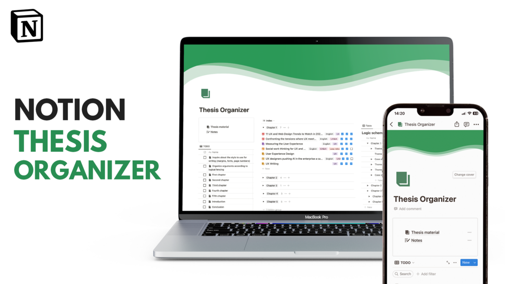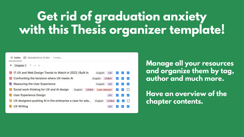 Thesis organizer template: Discover the ultimate Notion template for effortless thesis and master's dissertation writing. Effortlessly organize sources, outline chapters, clarify ideas, and track tasks – all in one place. Elevate your academic writing journey today!